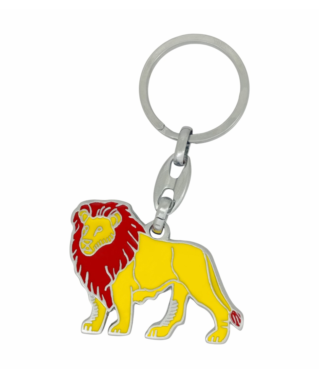 Bu aslan figürlü metal anahtarlık, güçlü ve dikkat çekici tasarımıyla öne çıkan özel bir aksesuardır. Sarı gövde ve kırmızı yele detayları canlı mine kaplama ile işlenmiş, parlak metal çerçeve ile tamamlanmıştır. Net hatlara sahip tasarımı sayesinde figür belirgin ve estetik bir görünüm sunar.