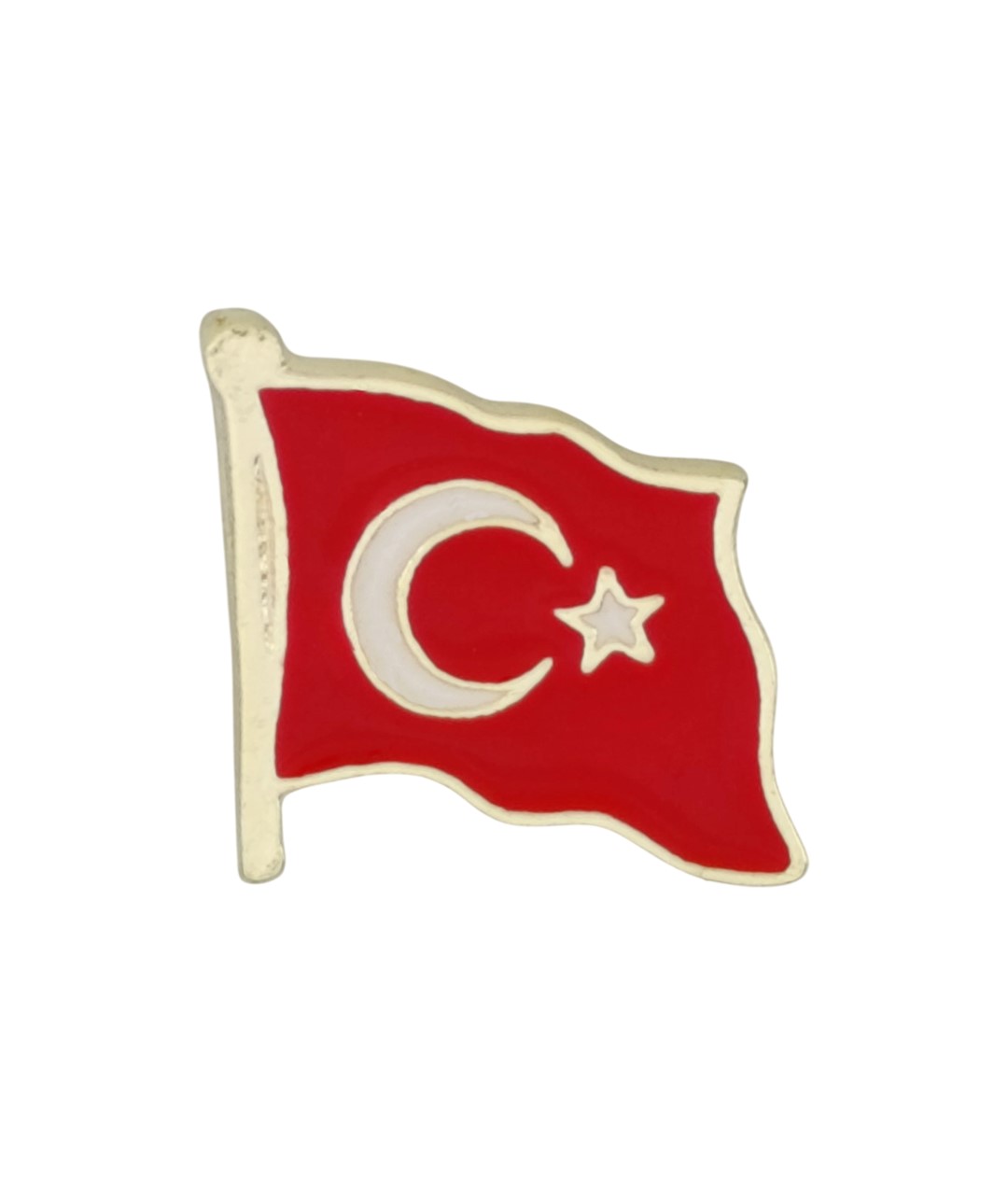 Dalgalı formda tasarlanan Türk bayrağı yaka rozeti, hareketli ve estetik görünümüyle dikkat çeker. Kırmızı mine dolgulu zemini ve beyaz ay yıldız detayı canlı ve net bir görünüm sunarken, altın renk çerçevesi tasarıma şıklık katar.