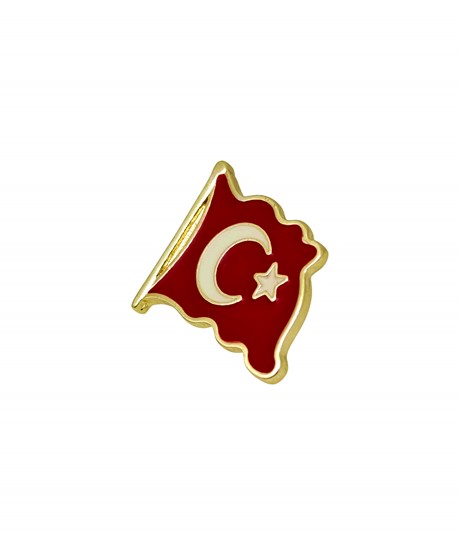 Dalgalı formda tasarlanan bu Türk bayrağı yaka rozeti, canlı kırmızı mine dolgusu ve belirgin ay yıldız detayıyla dikkat çeker. Altın tonlu çerçevesi ve bayrak direği detayı tasarıma şıklık ve bütünlük kazandırır. Kabartmalı metal yapısı sayesinde üç boyutlu ve estetik bir görünüm sunar.