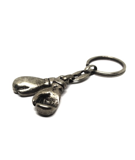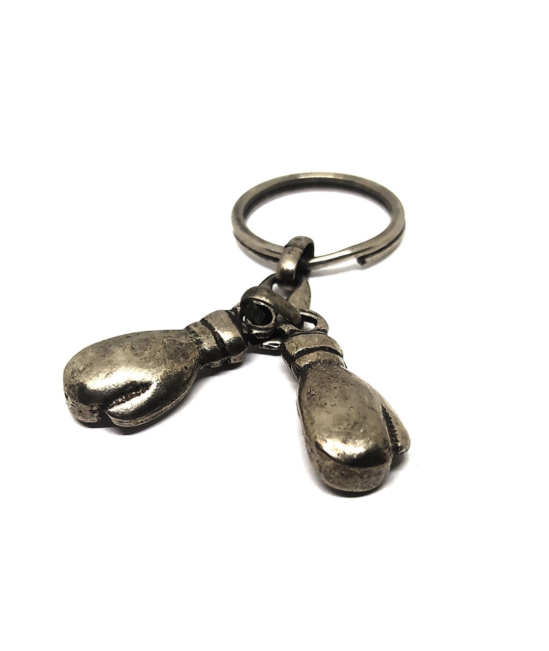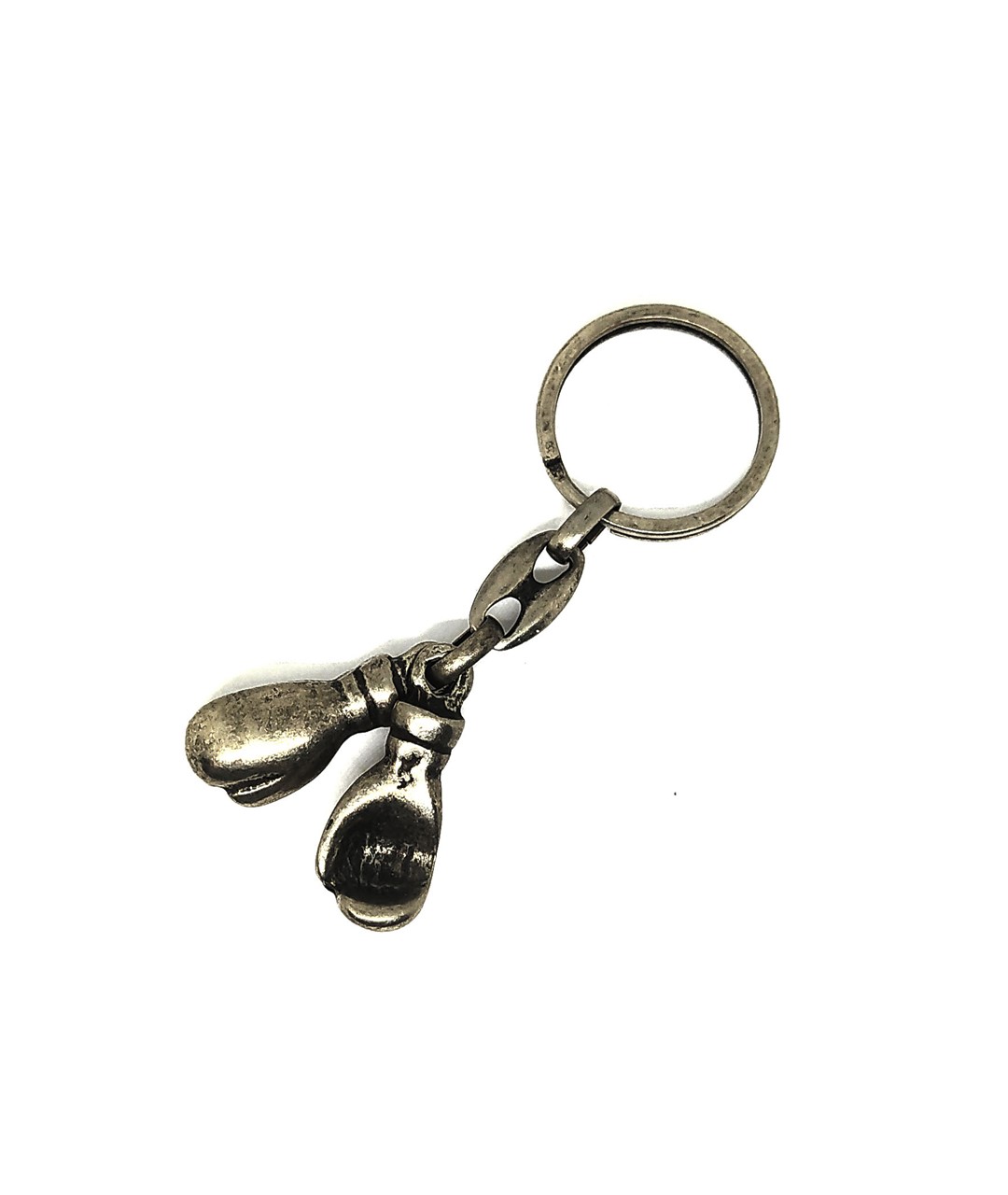 Görselde metal malzemeden üretilmiş, boks eldiveni figürlü bir anahtarlık yer almaktadır. İki adet minyatür boks eldiveni detayı, sağlam bir metal halka ile birleştirilmiş olup ürüne sportif ve güçlü bir görünüm kazandırmaktadır. Antik görünümlü metal yüzeyi, tasarıma nostaljik ve maskülen bir hava katmaktadır.
