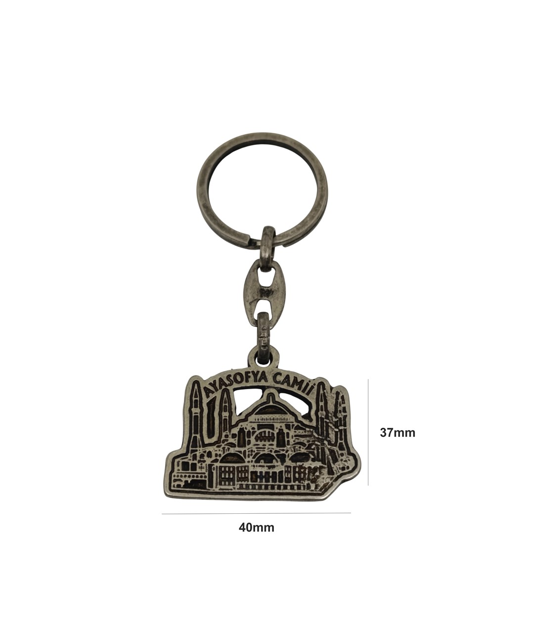 Ayasofya Camii figürlü metal anahtarlık, İstanbul’un simgesi olan tarihi yapıyı detaylı kabartma tasarımıyla yansıtan özel bir aksesuardır. 40 mm genişlik ve 37 mm yükseklik ölçülerine sahip olan bu model, kompakt yapısıyla günlük kullanım için idealdir. Eskitme görünümlü metal alaşımdan üretilmiş olup dayanıklı ve uzun ömürlüdür.