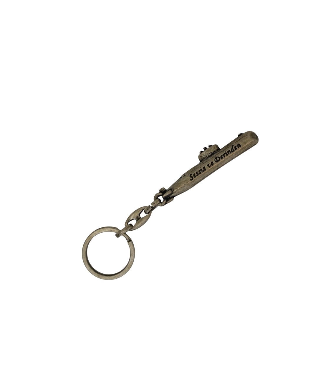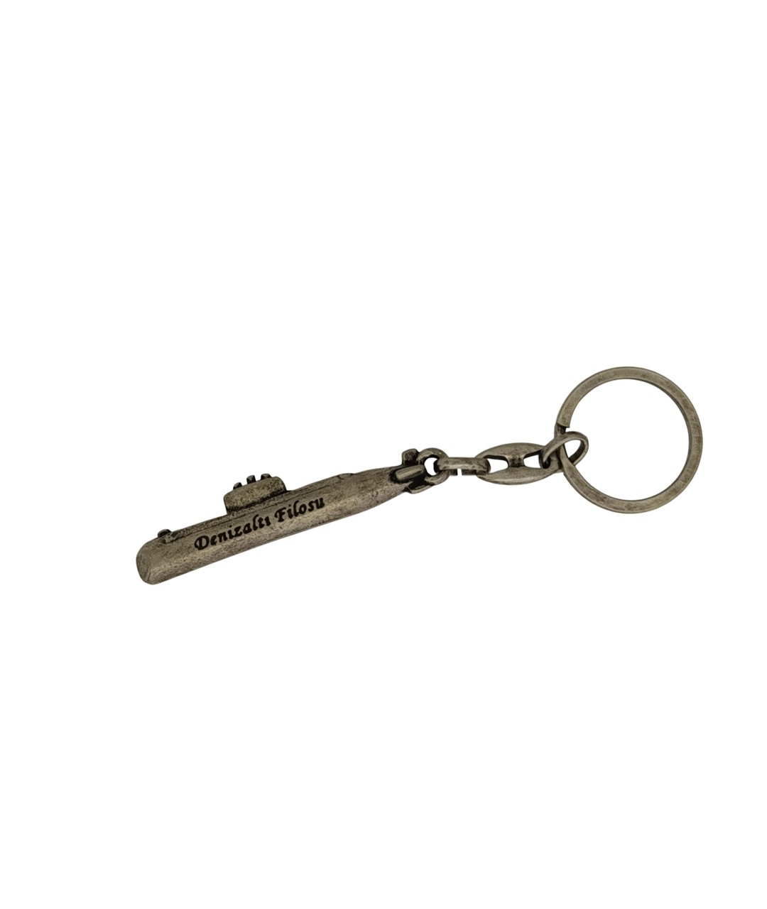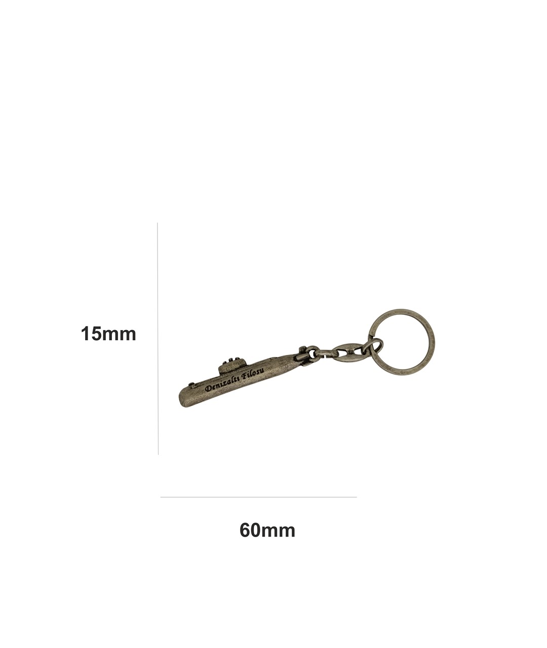 Denizaltı figürlü metal anahtarlık, denizcilik ve askeri temalı tasarımıyla dikkat çeken özel bir aksesuardır. Üzerinde yer alan “Denizaltı Filosu” yazı detayı ürüne karakteristik ve anlamlı bir görünüm kazandırır. Antik görünümlü nikel oksit kaplaması sayesinde nostaljik ve koleksiyonluk bir hava sunar.