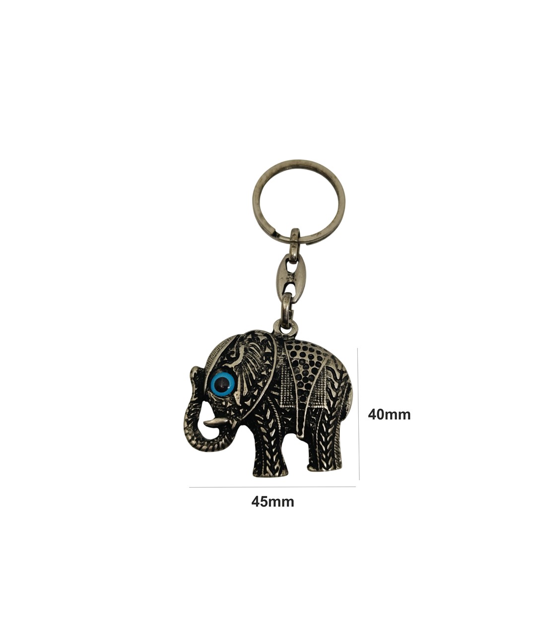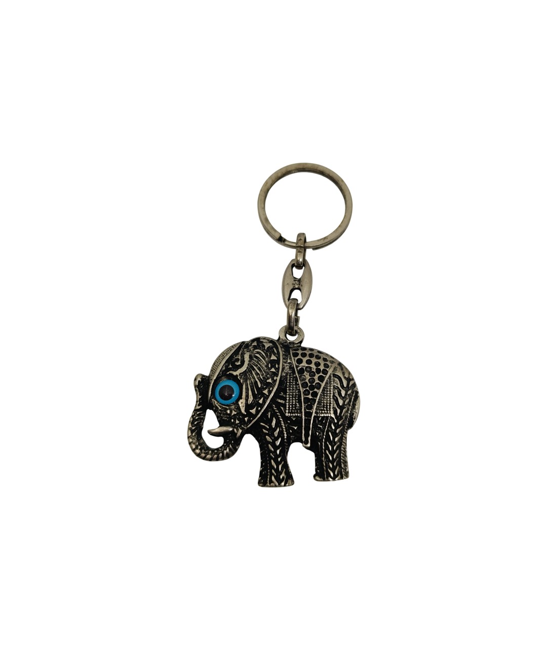 Görselde yer alan ürün, fil figürlü metal anahtarlıktır. Eskitme görünümlü nikel oksit kaplaması ve üzerindeki detaylı etnik motifler sayesinde otantik ve dikkat çekici bir tasarım sunar. Filin göz kısmında yer alan mavi nazar detayı ürüne hem estetik hem de sembolik bir anlam kazandırır.