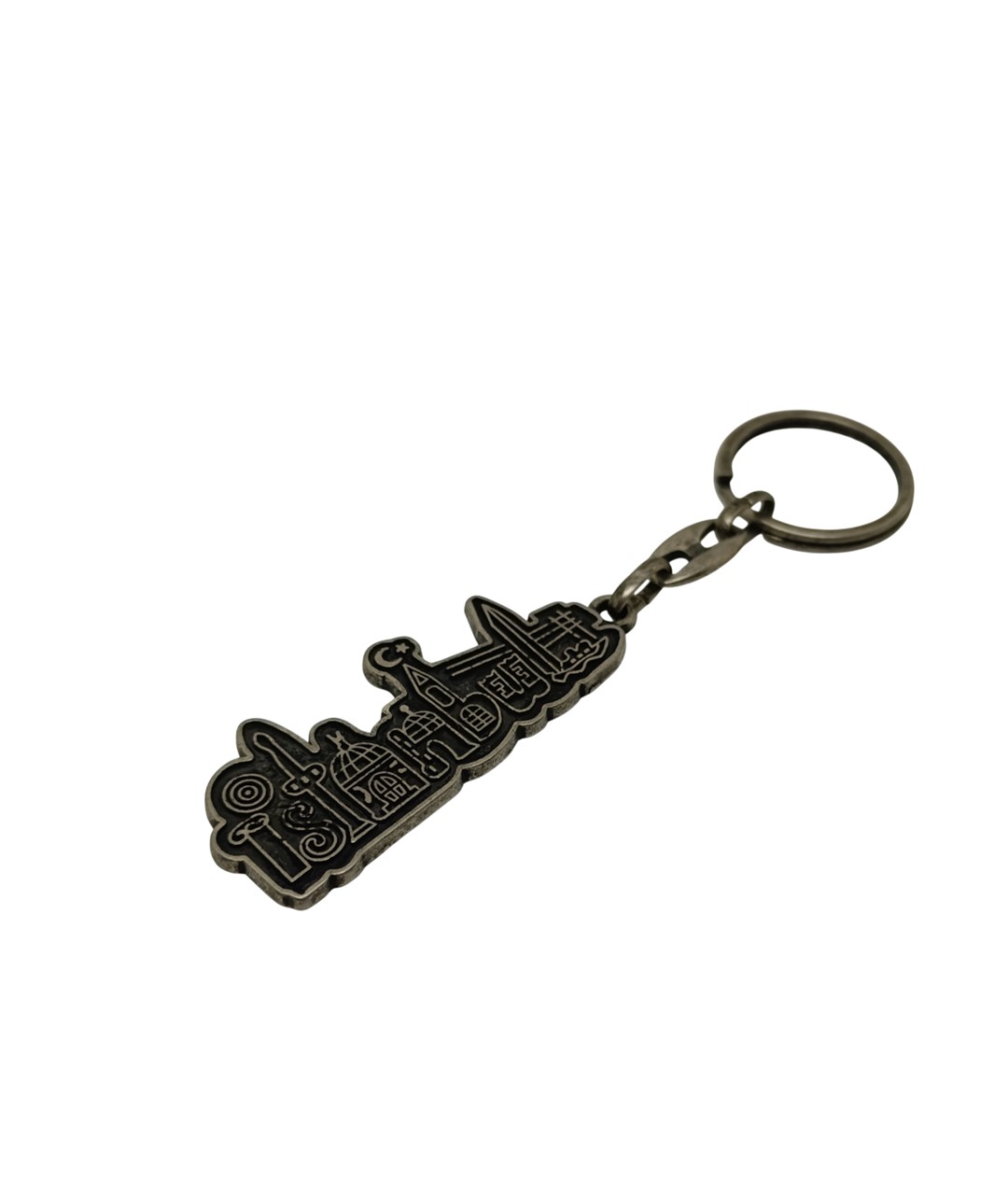 İstanbul siluet figürlü metal anahtarlık, şehrin simgesel yapılarından ilham alan detaylı tasarımıyla dikkat çeken özel bir aksesuardır. Nikel oksit kaplaması sayesinde antik ve şık bir görünüm sunarken, üzerindeki cami kubbeleri ve tarihi yapı siluetleri ürüne estetik bir karakter kazandırır.