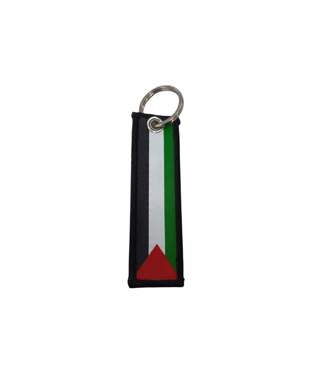 Filistin bayrağı desenli kumaş anahtarlık, sade ve anlamlı tasarımıyla dikkat çeken özel bir aksesuardır. Siyah zemin üzerine yerleştirilen beyaz ve yeşil şeritler ile alt kısımda bulunan kırmızı üçgen detayı, bayrak tasarımını net ve estetik bir şekilde yansıtır. Dayanıklı kumaş yapısı ve sağlam metal halkası sayesinde uzun süreli kullanım sunar.