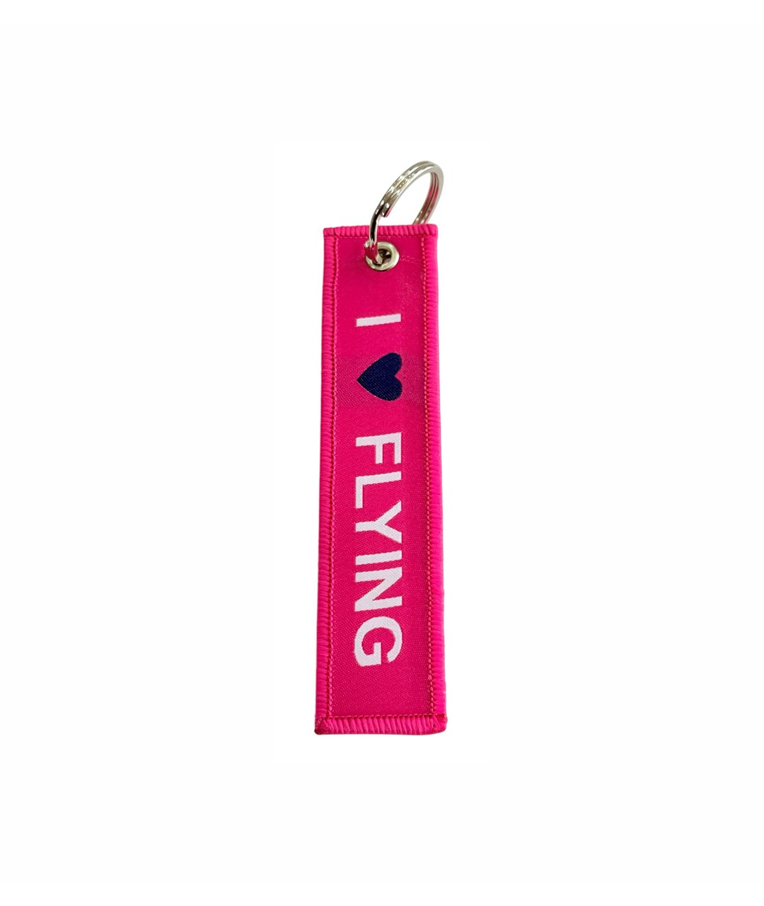 Pembe zeminli “I ♥ FLYING” yazılı kumaş anahtarlık, enerjik rengi ve dikkat çekici tasarımıyla öne çıkan şık bir aksesuardır. Canlı pembe arka plan üzerine beyaz yazı ve kalp detayı ile tasarlanan model, havacılık tutkunları için özel ve anlamlı bir seçenek sunar.
