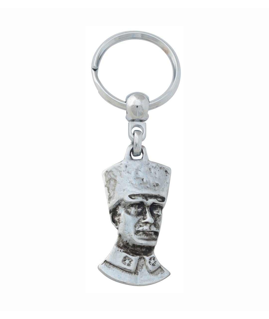 Bu görselde, metalden yapılmış bir anahtarlık üzerinde kalpaklı bir askerî lider ATATÜRK büstü yer almaktadır. Figür, güçlü ve kararlı bir yüz ifadesiyle tasvir edilmiş olup tarihî ve millî bir simgeyi temsil eder. Büstün detaylarında kalpak, üniforma yakası ve yüz hatları belirgin şekilde işlenmiştir. Parlak metal yüzey, anahtarlığa hem dayanıklı hem de estetik bir görünüm kazandırır.