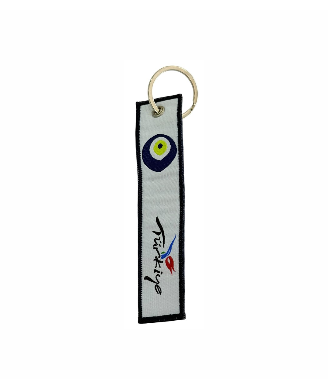 Görselde beyaz zemin üzerine tasarlanmış, siyah kenar dikişli kumaş bir anahtarlık yer alıyor. Anahtarlığın üst kısmında nazar boncuğu motifi bulunurken, alt bölümünde “Türkiye” yazısı ve lale figürü yer alıyor. Nazar boncuğu detayı, geleneksel Türk kültüründe kötü enerjilere karşı koruyucu bir sembol olarak bilinirken; lale figürü ise Türkiye’nin simgelerinden biri olarak estetik bir anlam taşır.