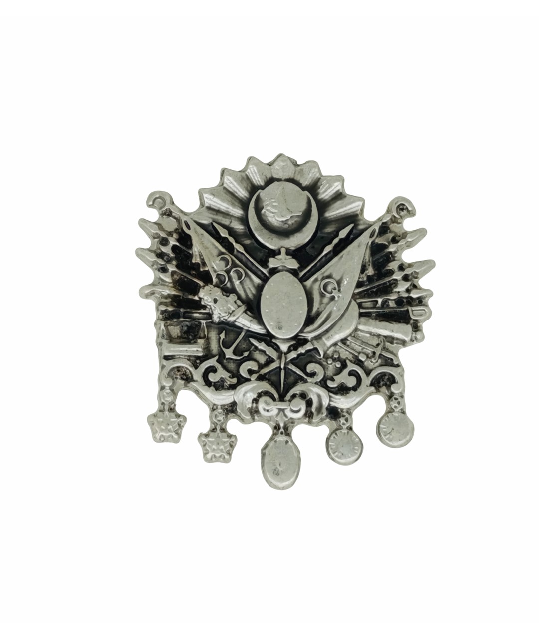 Osmanlı arması motifinden ilham alınarak tasarlanmış bu özel rozet, tarihî ve kültürel değerleri yansıtan dikkat çekici bir aksesuardır. Detaylı işçiliği ile öne çıkan tasarımda Osmanlı tuğrası, sancaklar, hilal ve geleneksel motifler yer alarak geçmişin ihtişamını simgeleyen estetik bir görünüm sunar.