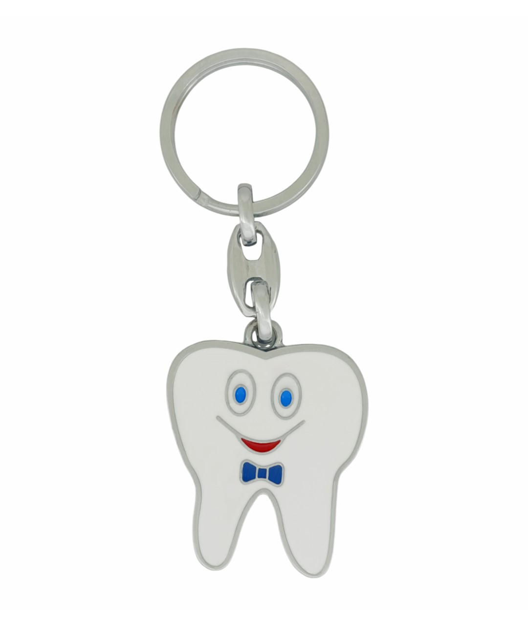 Bu diş figürlü metal anahtarlık, sevimli ve dikkat çekici tasarımıyla özellikle diş hekimleri ve diş sağlığı alanında çalışanlar için özel bir aksesuardır. Beyaz mine kaplama yüzeyi, mavi göz ve papyon detayı ile tamamlanarak eğlenceli bir karakter görünümü kazandırılmıştır.