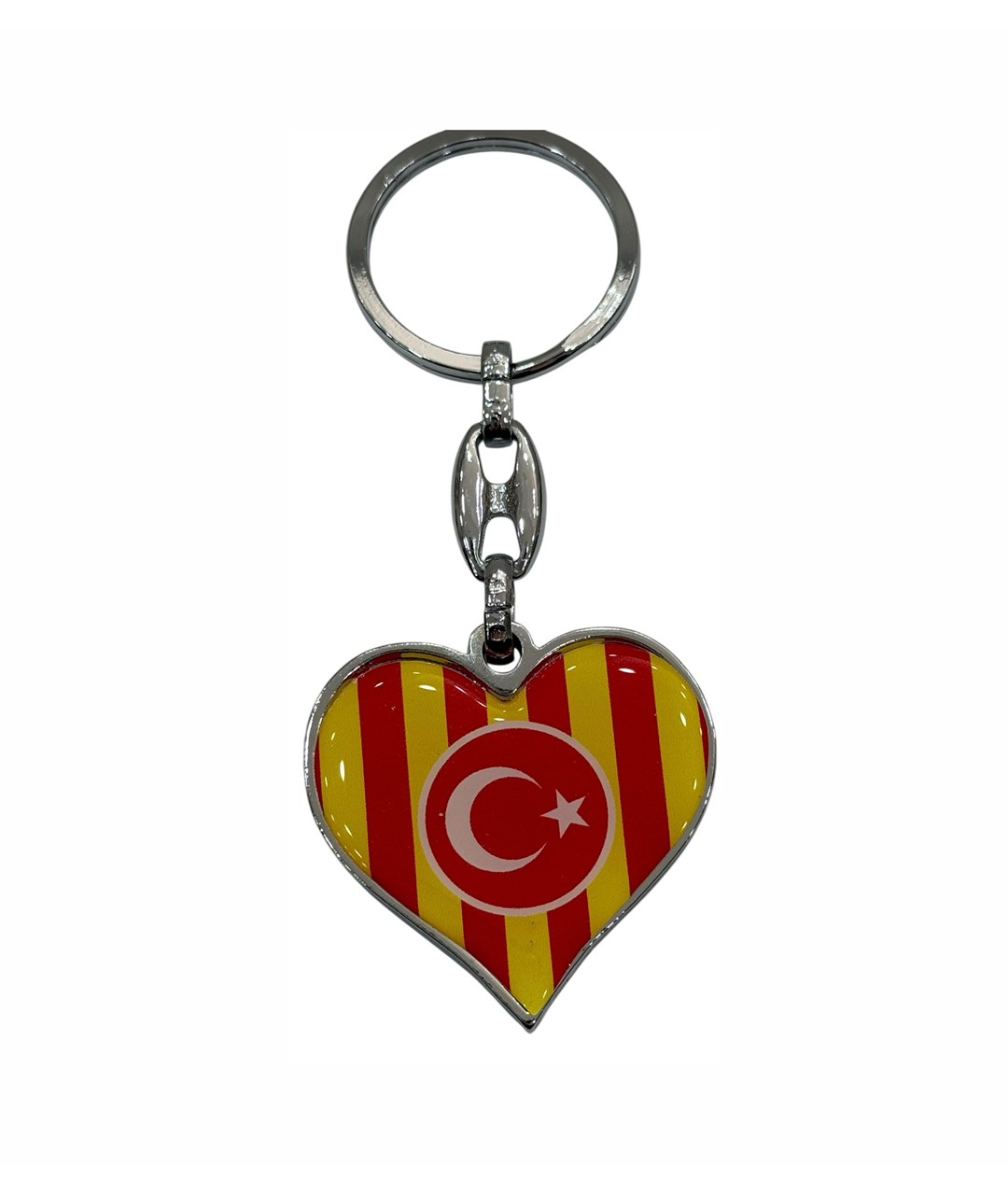 Bu şık ve dikkat çekici anahtarlık, kalp formunda tasarlanmış özel yapısıyla hem estetik hem de anlamlı bir aksesuar sunar. Sarı ve kırmızı renklerin uyumuyla öne çıkan tasarım, ortasında yer alan ay-yıldız detayıyla güçlü bir görsel bütünlük oluşturur.