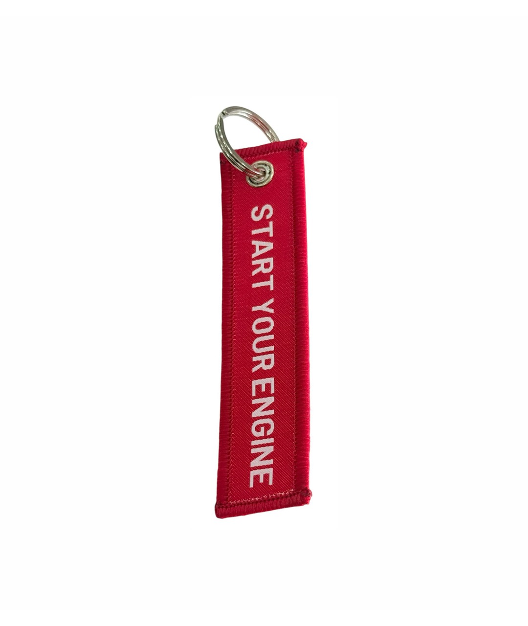Görselde kırmızı zemin üzerine beyaz “START YOUR ENGINE” yazılı kumaş anahtarlık yer almaktadır. Dinamik ve enerjik tasarımıyla dikkat çeken bu model, motor sporları ve otomotiv tutkunları için özel bir stil yansıtır. Canlı kırmızı rengi ve net yazı karakteri sayesinde sportif ve iddialı bir görünüm sunar.